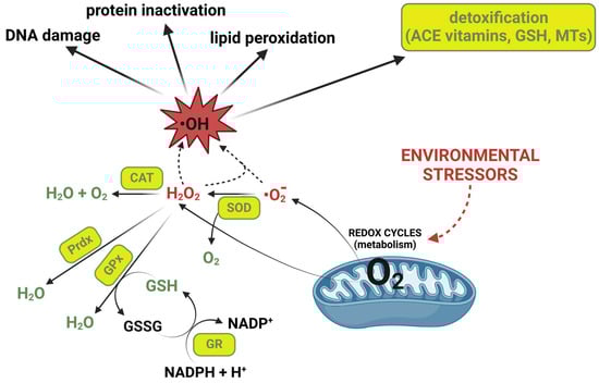 O2, a vital molecule for the existence of many organisms on Earth, plays a pivotal role in all oxidation reactions that define aerobic cell metabolism. It serves as the ultimate acceptor in the electron transport chain, leading to the production of ATP at the mitochondrial level. In these processes, O2 is reduced to water. However, some electrons can directly react with O2, forming reduction intermediates known as reactive oxygen species (ROS) and nitrogen species and include superoxide radicals (•O2−), hydroxyl radical (•OH), singlet oxygen, hydrogen peroxide (H2O2), peroxynitrite (ONOO−), and many others []. It has been estimated that about 3% of the O2 utilised by the cell is improperly converted into ROS, either through the activation of the mitochondrial electron transporter chains; spontaneous oxidation of reduced flavinins, hydroquinones, catecholamines, and ferredoxins; or the action of enzymes like xanthine oxidase, aldehyde oxidase and flavin dehydrogenase []. This formation rate can significantly increase under various physiological and stressful conditions such as physical activity, immune response, ageing, disease, and exposure to xenobiotics [,,].