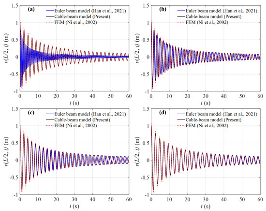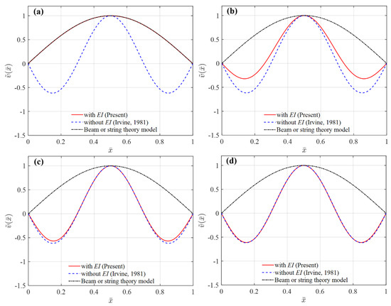 (2) and can control the symmetrical vibration of the STAC similar to the motion of the cable, beam, and cable–beam: when (or ), the STAC is similar to the Euler beam, and the effect of on its natural frequency can be ignored. When (or ), the STAC is equivalent to changing from a taut string model to a cable model as increases. When , the modal characteristics can be considered to be between the cable and the beam.