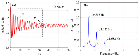 Figure 11a, it can be found that the anchor cable’s vibration energy is quickly dissipated due to the hydrodynamic damping force. The time required for the amplitude to reach a steady state is much less than that in the free vibration of the tension cable in air. It indicates that the hydrodynamic damping force is beneficial to control the vibration of the STAC system. Comparing the free attenuation vibration of the anchor cable in the same period (0–50 s), we can find that the hydrodynamic damping force plays a dominant role in attenuating the free vibration of the anchor cable compared with the material damping force. In addition, according to Equation (57) and