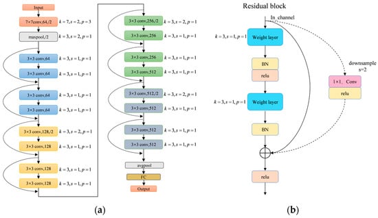 The ResNet-18 network is primarily composed of stacked residual blocks, consisting of one convolutional layer, two pooling layers, one fully connected layer, and eight residual blocks (each block containing two convolutional layers). Figure 1a depicts the structure of the ResNet-18 network, while Figure 1b illustrates the structure of the residual block. In Figure 1, dashed lines represent changes in the number of channels, solid lines indicate no change in the number of channels, k represents the receptive field size of neurons in the convolutional layer, s represents the stride, and p represents the number of zero-padding at the borders.