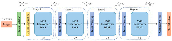 The Vision Transformer (ViT) [41] network, after being thoroughly pre-trained on large datasets such as ImageNet-21K and JFT-300M, has been transferred to smaller datasets. In numerous classification tasks, it has matched or even surpassed the performance of current state-of-the-art CNNs. The Swin-t [42] network further extends the applicability of the Vision Transformer (ViT) network. The Swin-t network demonstrates strong performance in recognition tasks such as image classification, object detection, and semantic segmentation. It achieves a good balance between computational efficiency and performance. The overall architecture of the Swin-t network is shown in Figure 2. An input RGB image of size H × W × 3 is divided into non-overlapping, equally sized patches using the Patch Partition module. Each patch is treated as a token, with its features being the concatenated RGB values of the image pixels. The Linear Embedding Block projects the tensor into an arbitrary dimension C. Subsequently, these tensors are fed into the Swin Transformer Blocks with enhanced self-attention mechanisms, as shown in Stage 1 (the first dashed box in Figure 2). As the network depth increases, the number of tokens is reduced through the Patch Merging Block. The Patch Merging Block concatenates each group of 2 × 2 adjacent patches, forming a 4C-dimensional concatenated feature. A linear layer is then applied to this concatenated feature, reducing the output to 2C. The features are then transformed using the Swin Transformer Block. The first Patch Merging Block and its corresponding feature transformation Swin Transformer Block are designated as Stage 2 (as shown in the second dashed box in Figure 2. Repeating the same process as in Stage 2 two more times results in Stage 3 and Stage 4 (as shown in the third and fourth dashed boxes in Figure 2, respectively). Finally, the Classification layer produces the final prediction vector.