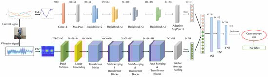 The model architecture is illustrated in Figure 4. This model effectively retains fault features from both current and vibration signals through a dual-channel setup. Specifically, the current signal is dimensionally reduced using Park transformation to extract a one-dimensional PVM signal from the three-phase current, thereby reducing redundant data. On the other hand, the vibration signal undergoes continuous wavelet transform to be elevated to a two-dimensional time–frequency image, capturing more detailed fault features. The processed signals are then fed into the training model for feature extraction, aiming to enhance the accuracy of fault diagnosis.
