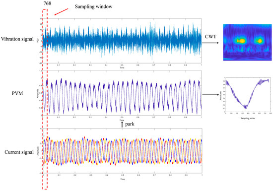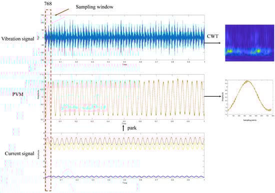 (1) Using the CWT method, one-dimensional vibration signals are converted into two-dimensional time–frequency images, enriching the model’s input with more fault features. The Park transformation is utilized to convert three-phase current signals into PVM signals, simplifying the input parameters of the model. The constructed model performs feature extraction and fault classification directly on the raw signals, requiring minimal specialized knowledge and experience in signal processing. By analyzing time–frequency images and PVM signals under different loads, it was found that fault signals of the same state exhibit certain similarities across various loads. Consequently, fault signals of the same state under different loads are classified into a single fault category. After aligning the time–frequency images and PVM signals in the time domain, fault diagnosis samples are established. These samples enable cross-domain and bimodal input for fault diagnosis.
