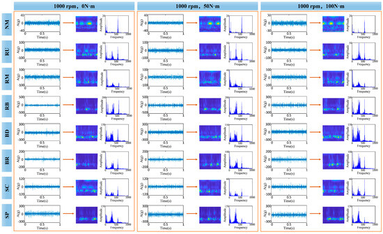 In studying the vibration and current signals under different loads, whether the vibration and current signals exhibit similar characteristics at the same speed but different loads is explored. In Figure 8, three different steady states are depicted, including the original vibration signals, CWT (continuous wavelet transform) images, and the amplitude–frequency plot of the vibration signals. The CWT images shown in Figure 8 are obtained using the moving window method to capture partial images, while the amplitude–frequency plot displays the frequency distribution of the entire time sequence of the original vibration signals. It can be clearly observed that the original vibration signals from the three operating conditions are difficult to directly distinguish between different faulty motors, and the original vibration signals also vary across different operating conditions. From the CWT images, differences can be seen between the time–frequency plots of the same load but with different fault states, with each fault type exhibiting distinct fault characteristics in the time–frequency plots. The time–frequency plots of the same motor state under different loads exhibit some degree of similarity, as further verified by the analysis of the amplitude–frequency plots. The amplitude–frequency plots illustrate the frequency distribution of motor vibration signals under different operating conditions. Based on the amplitude–frequency plots, it can be observed that the frequency distribution of motor vibration is approximately similar under different loads but in the same motor state. The variation lies in the magnitude of amplitude, which is manifested as changes in brightness and darkness in the CWT images.