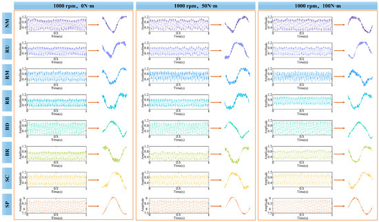 In the setup shown in Figure 5, the marathon_d396a type three-phase asynchronous motor is set to a constant speed of 1000 r/min. Steady-state data are collected under different loads, with the load torque set to 0 , 50 , and 100 . The data used in the experiment include the vibration acceleration data from the motor drive end and the stator current data, both collected by sensors. The sampling frequency for both the current and vibration sensors is 25,600 Hz, and the data collection duration is 10 s. For each operating condition, 256,000 samples of motor current and vibration signals are collected to establish the experimental dataset for subsequent data processing.