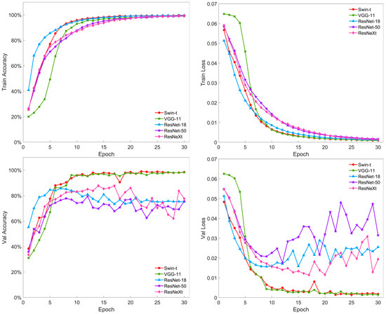 To evaluate the performance of single models, classical CNN models and the Swin Transformer model were used for motor fault diagnosis on the same dataset. The input for all models consisted of two-dimensional time–frequency images under different motor fault conditions. The models were comprehensively evaluated based on the training process, accuracy, and generalization capabilities. It is noteworthy that to enhance the model’s generalization, regularization techniques (such as Dropout and image sample expansion) were employed during training. These regularization techniques were turned off during testing and validation. Consequently, in the early stages of iteration, the validation set accuracy may be higher than the training set accuracy. As training progresses, model parameters become more fixed, which improves performance on training data but may reduce generalization capability on test data.