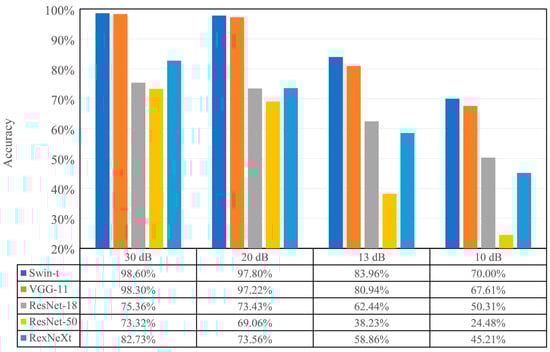 To validate the generalization capabilities of different single-modality models, we tested the trained models on a test set with varying levels of noise added. The test results are shown in Figure 11. The results indicate that the Swin-t model outperforms other models in terms of performance and has fewer training parameters. However, under strong noise interference, the Swin-t model’s performance deteriorates. To address this issue, a dual-modality model is proposed to enhance the model’s robustness and generalization. The dual-modality model is based on the best-performing Swin-t model from the single-modality experiments.