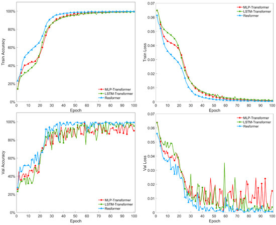 Figure 12 shows the accuracy and error loss curves of the dual-model training results. It is evident that with the increase in iterations, the training accuracy of all three models gradually increases, with minor fluctuations. The validation accuracy also gradually increases but shows instability during the process. Figure 12 demonstrates that Resformer not only converges faster on the training set but also exhibits smaller fluctuations in both the validation accuracy and loss curves. The MLP-Transformer model achieves a high training accuracy smoothly over the training curve, yet its validation accuracy curve does not converge. In contrast, the validation accuracy curve for the LSTM-Transformer model, despite experiencing oscillations in the early iterations, eventually converges within a certain range.