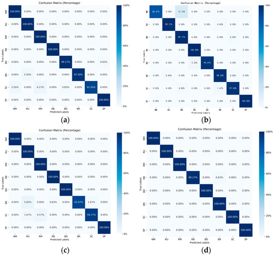 The Confusion Matrix for the Resformer model under various noise levels is presented in Figure 15. The fault state detection of the model is analyzed using the indicators presented in the literature [50], with the calculation results displayed in Table 6 and Table 7. The Resformer model demonstrates excellent performance regardless of low or high noise levels. It is worth noting that even under different noise conditions, the model does not produce false alarms for normal motor operation.