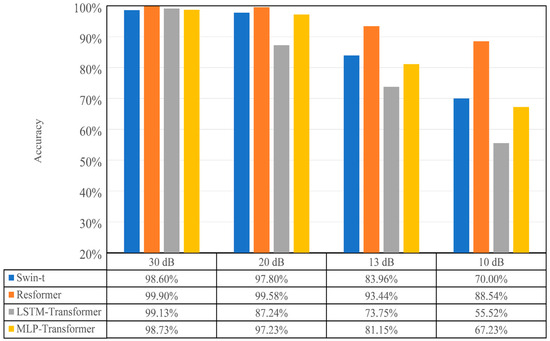 In this section, we compare the proposed Resformer model with large models (Swin-s and Swin-b) [42] under the Transformer architecture and classic large models (VGG) [49] under the CNN architecture. We also provide a detailed analysis of the Resformer model’s performance under various interference signals.