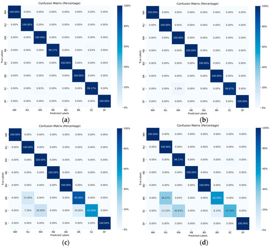 The confusion matrix for the Resformer model under different noise impacts. (a) 30 dB; (b) 20 dB; (c) 13 dB; (d) 10 dB.