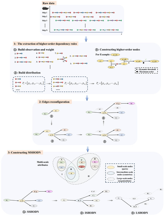 Based on the foundation established by BuildHON+ for constructing the HODN [25,26,27], we propose the use of BuildMSHODN to create the MSHODN and MSFODN. The output comprises a MSHODN generated for GLSRF (Small-scale Higher-Order Dependency Network (SSHODN), Intermediate-scale Higher-Order Dependency Network (ISHODN), and Large-scale Higher-Order Dependency Network (LSHODN)) along with MSFODN (Small-scale First-Order Dependency Network (SSFODN), Intermediate-scale First-Order Dependency Network (ISFODN), and Large-scale First-Order Dependency Network (LSFODN)). The specific steps of the BuildMSHODN are illustrated in Figure 2.