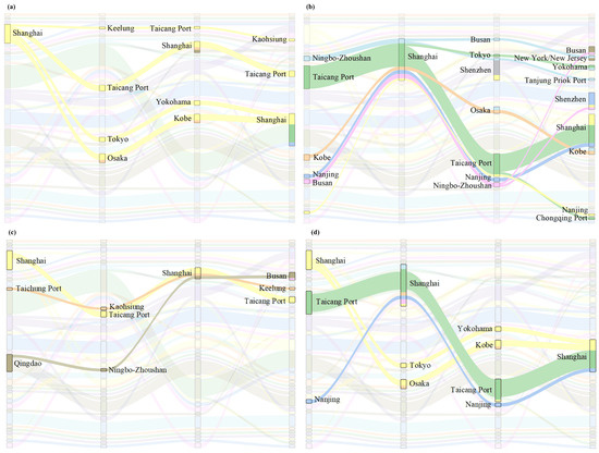 Within GLSRFs, after completing the analysis of second-order dependency relationships, we further examine higher-order dependencies. Figure 7 illustrates related third-order dependency paths using Shanghai as an example. Figure 7a shows , revealing that container ships departing from Shanghai, if proceeding next to Keelung, tend to move to Taicang and Kaohsiung in the following steps, thus forming a complex quaternary interaction among Shanghai, Keelung, Taicang, and Kaohsiung. Similarly, if a ship moves next to Tokyo from Shanghai, it tends to move to Yokohama and then return to Shanghai, thereby forming a ternary interaction relationship through a third-order dependency path among Shanghai, Tokyo, and Yokohama. Figure 7b displays , yielding the following results: if two container ships are currently in Shanghai and one’s previous step was Ningbo-Zhoushan, it is more likely to move next to Tokyo and Tanjung Priok Port or to Busan and New York/New Jersey; if another ship’s previous step was from Taicang, it is more likely to return to Taicang. Thus, these two ships form different types and orders of multiple relationships within the GLSRF. Similarly, Figure 7c,d show related results for and .