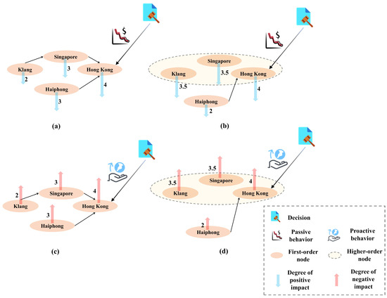 In summary, when conducting small-scale experiments within the GLSRF, setting proves effective for the subsequent mining of higher-order dependency paths and key nodes identification. Figure 5c reveals that the ports of Klang, Singapore, and Hong Kong exhibit strong second-order dependencies. After mining these dependencies through SSHODN, the impacts of these results are analyzed: Figure 6a,b represent networks constructed without and with the consideration of higher-order dependencies, respectively. In (a), if higher-order interactions are disregarded and assuming, Hong Kong suffers a passive behavior such as an internal crisis or external sanctions, impacting it negatively by four points; it is generally believed that Singapore and Haiphong, which have direct connections, may be negatively impacted by three points, while Port Klang, which lacks direct connections, may be negatively impacted by two points. However, the presence of dependency relationships between ports is crucial for overall network dynamics; thus, in (b), the mined Klang, Singapore, and Hong Kong are constructed as higher-order nodes for further network analysis. When Hong Kong experiences negative impacts, it is more likely to affect the ports of Klang and Singapore compared to Haiphong, significantly impacting their operations and development. This underscores the strong dependencies among them; hence, SSHODN could be used in the future to more accurately simulate the dynamic changes and impacts on GLSN when subjected to network attacks. Conversely, (c) and (d) illustrate that if Hong Kong faces more economic opportunities or policy support, compared to ports with less significant dependencies, Klang and Singapore might also gain greater developmental advantages.