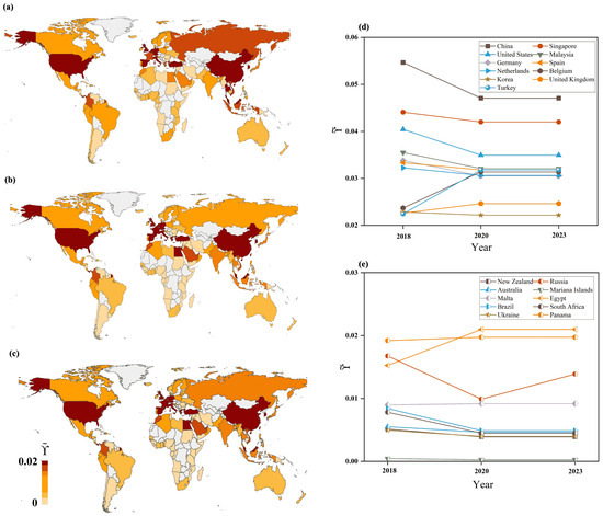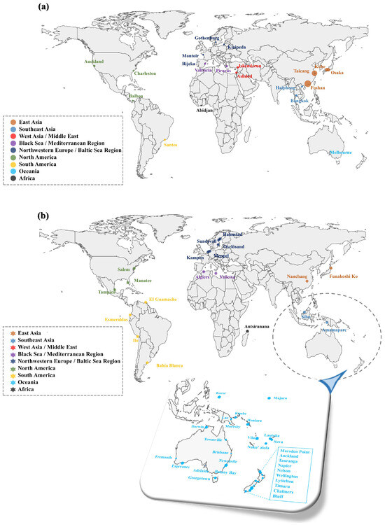 : Ports with strong dependencies tend to be more evenly distributed along both the east and west coasts of the United States (US). In Figure 9a, Charleston and Auckland in the US are identified as key ports through . Interestingly, they are located on the east and west coasts, respectively, playing significant roles in transshipment and processing for shipping routes from Asia to the east coast and from Europe to the west coast [36]. Therefore, they are not only key nodes within the US maritime trade network but also indispensable hubs in the global supply chain.