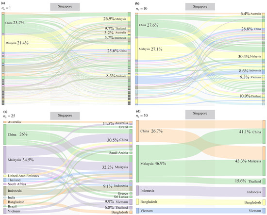 Example of second-order dependency relationships in the SSHODN. (a–d) Nodes on either side representing paths with dependency relationships using Singapore (port) as the hub node (). The percentage on the left node indicates the proportion of to . The percentage on the right node indicates the proportion of to .