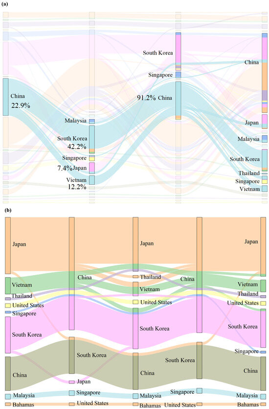 The shuttle of ships between ports and their associated logistics facilities constitutes Global Liner Shipping Route Flows (GLSRFs), which converge into thousands of routes daily [1,7]. These GLSRFs intertwine to form a vast, self-organized Global Liner Shipping Network (GLSN) [8,9]. The GLSN plays a crucial role in the global economy, reflecting regional economic conditions and relevant policy support. During periods of robust regional economic growth, GLSRFs tend to concentrate in economically active areas to meet production and consumption demands. Conversely, during economic crises or severe sanctions, GLSRFs adapt by reducing interactions with the affected regions [10]. Initiatives such as the “Maritime Silk Road” significantly alter the structure and scale of the GLSN, enhancing the economic interdependence among the involved countries [11,12]. Moreover, changes in any national trade policy impact the GLSRFs of other countries, necessitating global cooperation and coordination to ensure the stability and development of the GLSN [13]. Additionally, the accuracy of data representation in the GLSN greatly influences the mining of higher-order dependencies and the identification of key nodes in the system [13].