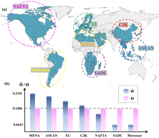 : can reveal key ports that may be overlooked by traditional methods, enriching our understanding of global trade dynamics. Unlike traditional statistical and network-based key node identification methods, considers the global structural characteristics of the GLSN (the importance of a port depends not only on the number of its direct connections but also on the quality of these connections) and can also effectively reveal the true status and role of ports in the global trade network by incorporating higher-order dependencies. In Figure 9a for the North America region, the Port of Balboa in Panama shows a . This increase is primarily attributed to Balboa’s location on the Pacific side of the Panama Canal, one of the most crucial ports of the Panama Canal. The Panama Canal [34] allows ships passing through Balboa to quickly enter the Atlantic or move from the Atlantic to the Pacific, significantly reducing the travel distance and time of international routes. Particularly, the maritime routes from China and Japan to the east coast of the United States heavily depend on the Panama Canal, thus playing a vital role in strengthening the links between Asian manufacturing and the markets in the Americas and Europe [35]. Although Balboa’s throughput is not among the highest globally, analysis identifies its significant strategic position from the perspectives of higher-order structure and global dependency. It shows that the MSHOD can reveal nodes that, despite having smaller cargo throughput, have a significant impact on global trade flows, thus providing a more comprehensive and deeper analytical perspective for the GLSN.