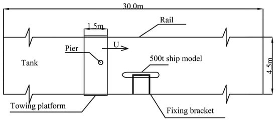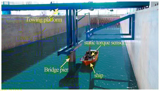 In a generalized water tank with a length of 30 m, a width of 4.5 m, and a height of 1.2 m, a relative static water experiment is conducted to simulate a ship–pier encounter process. The experimental ship model, pier, and sliding platform are shown in Figure 1 and Figure 2. Specifically, a torque sensor is installed on the barycenter of the ship model and connected to a fixed bracket via a rigid rod. The pier model is fixed under the sliding platform vehicle and passes under the ship model at a uniform speed. Along the course, the torque sensor measures the change in the yaw moment (with rotational torque centered on the Z-axis).