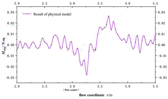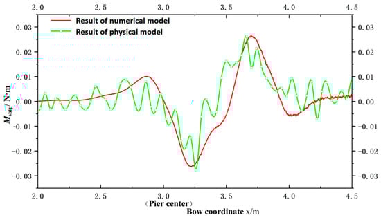 The numerical model corresponding to the physical model was calculated in the following conditions: T = 0.9D and the ship passing the pier in the X direction at a speed of 0.283 m/s. As illustrated in Figure 7, the yaw moment generated by the physical model and the numerical calculation demonstrates consistent patterns (positive peak–negative peak–positive peak).