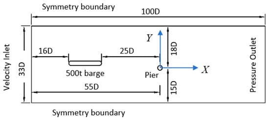 The geometric scale of the numerical model is 1:50, and a common inland waterway cylindrical pier and a 500 T class barge are selected for the numerical calculation. Herein, the length, width, and draft of the ship are 0.9 m, 0.2 m, and 0.032 m, respectively, and the pier diameter (D) is 0.1 m. As shown in Figure 4, the calculation boundary is set to not disturb the turbulent flow around the pier, the inflow boundary is 55D away from the pier axis, the outflow boundary is 45D away from the pier axis, and the two symmetric boundaries on both sides are 18D and 15D away from the pier axis, respectively. The generalized ship model encounters the pier in the X direction at a steady cruising speed v and at a distance of 25D from the pier, and the distance between the ship’s side and the pier wall is T = 16.5D.