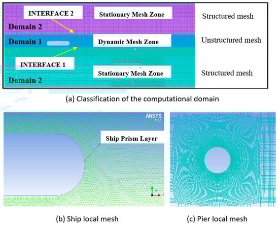 In this study, the simplified two-dimensional planar motion of the ship in the bridge area is treated as a three-degrees-of-freedom problem: the longitudinal movement along the X-axis; the lateral drift caused by the transverse forces induced by the disturbed flow around the pier; and the rotation of the ship due to the moment generated by the uneven hydrodynamic distribution. The displacement of the moving ship is significantly larger than the mesh size, which can result in excessive mesh distortion and lead to non-convergence in the calculations. Therefore, the spring smoothing method and the local remeshing method are used to update the mesh. The local remeshing method is only applicable to tetrahedral and triangular meshes, which are unstructured meshes. In the same computational domain, unstructured meshes generate more mesh elements than structured meshes while still satisfying the flow field calculation conditions. To reduce the mesh updating time and save computational resources, a multi-region computational model is employed, as depicted in Figure 5. The interface is used for connection and data transfer between the computational domains. Specifically, Domain 1 contains the ship. It is the dynamic mesh area and uses triangular unstructured meshes. In this domain, quadrilateral meshes are divided around the ship as boundary-layer meshes, which move with the ship, while the other meshes are updated as the ship moves. Domain 2 contains the pier and the other stationary mesh areas. These meshes are not updated as the ship moves, and quadrilateral structured meshes are used. The mesh size has 98,883 cells, and the size of the pier’s radial first-layer grid is 0.01D, also taking a time step size of 0.005 s to calculate. In the preliminary simulation verification, the selected grid density showed consistency with the experimental data and expected results, indicating that the current grid density adequately reflects the actual situation. Therefore, we believe that this grid density is a reasonable choice without increasing the computational burden. Moreover, in critical areas (such as around the ship), more refined boundary-layer meshes (quadrilateral meshes) are used to ensure that the flow details in these areas are fully resolved. This treatment further enhances the overall reliability and accuracy of the simulation.