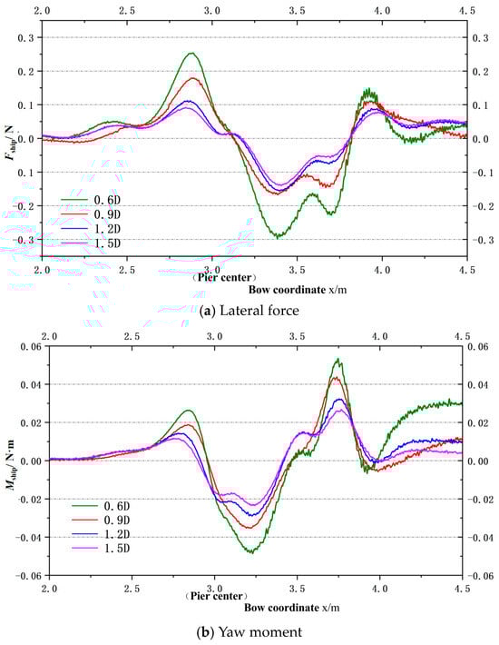 When the ship passes piers at different ship–pier transverse distances, the duration curves of the lateral force exerted on the ship (causing the ship to move laterally along the Y axis) and the yaw moment of the ship are demonstrated in Figure 8a and Figure 8b, respectively.