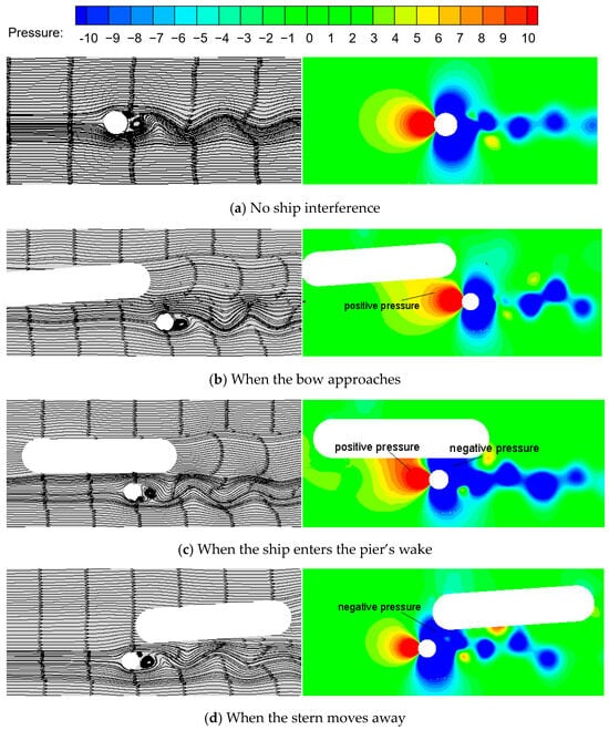 To better explain the evolution of the yaw moment (T = 0.6D), a comprehensive analysis is conducted. This analysis combines the lateral velocity distribution around the pier with local streamlines and the pressure distribution around the ship at typical positions as it passes the pier, as shown in Figure 9.