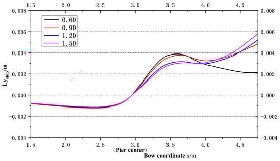 Figure 10 illustrates the change curve for the Y barycentric coordinate of the ship when it passes the pier when T = 0.6D, 0.9D, 1.2D, and 1.5D. It is observed that the ship’s barycenter slightly approaches the pier before moving away at distances of 0.6D, 0.9D, 1.2D, and 1.5D. When T = 0.6D and 0.9D, the ship approaches and moves away from the pier at larger magnitudes; when T = 1.2D and 1.5D, the Y barycentric coordinate of the ship remains almost unchanged.