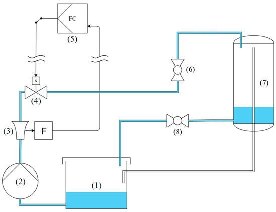 The flow control system consists of a main water tank (1), single-phase electric motor-driven centrifugal pump (2), flow meter (3), solenoid valve (4), flow controller (5), disturbance ball valve (6), secondary water tank (7), drain ball valve (8), and corresponding copper piping, as shown in Figure 1.