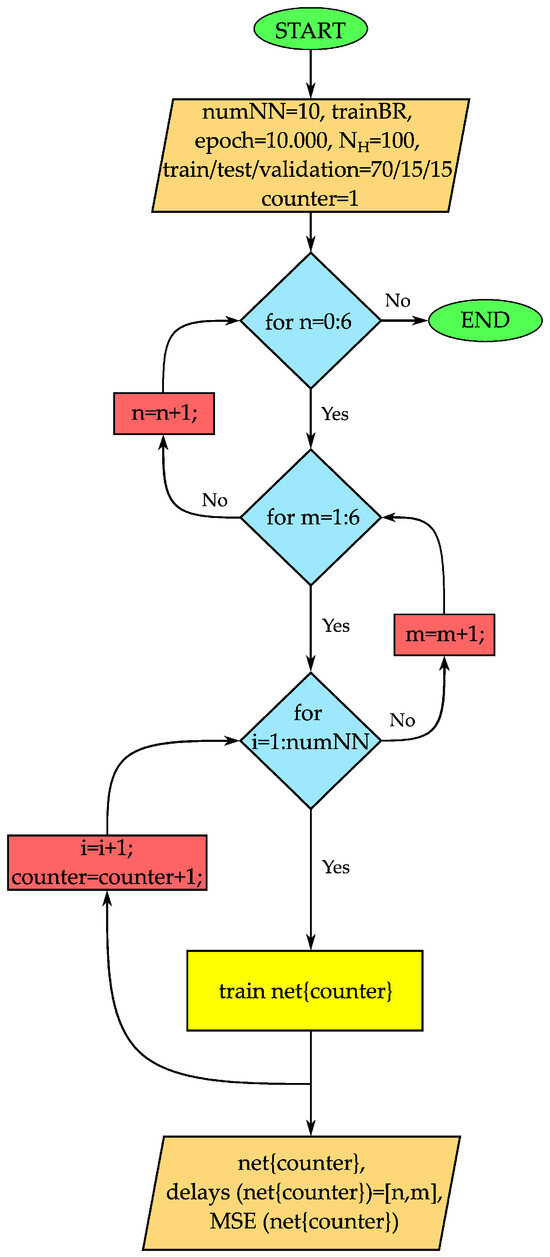 As a result of one training iteration based on the flowchart shown in Figure 3, 420 ANN NARX models were stored in a cell net{} along with 420 combinations of the delays m and n, stored in a cell delays(net{}). For each trained model, MSE was calculated during the training process and stored in cell MSE(net{}).