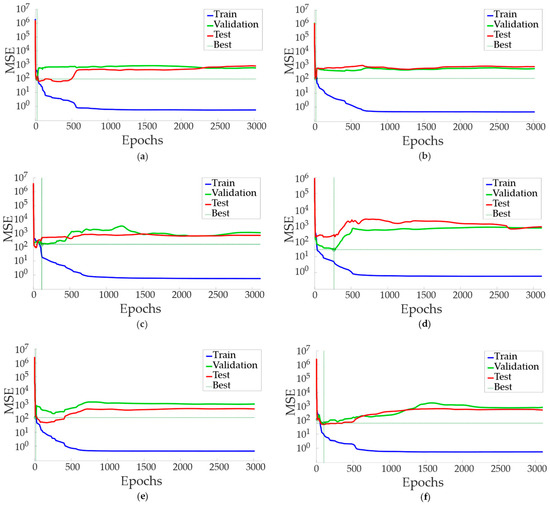 Convergence of the MSE during training: (a) using 1st permutation of data; (b) using 2nd permutation of data; (c) using 3rd permutation of data; (d) using 4th permutation of data; (e) using 5th permutation of data; and (f) using 6th permutation of data.
