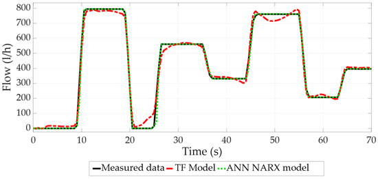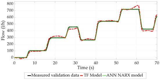 The best-performing ANN NARX model with six flow and two voltage delays is selected based on the results presented in this paper and is compared to the previously developed transfer function (TF) model presented in [2]. Models were tested on two datasets using the GoF measure as it was the only measure used in previous research. Comparison results are presented in Table 5, and the time-response graphs are shown in Figure 7 and Figure 8. The results of the statistical analysis indicate that the newly presented ANN NARX model significantly outperforms the previous TF model, with the paired-sample t-test showing a p-value of 0.016 (t = 39.839, df = 1)