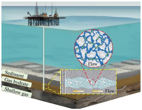 The world’s energy consumption structure is transitioning from fossil fuels to clean energy sources [1]. Over the past 20 years, the primary energy consumption structure has shown a decreasing trend in the proportion of traditional fossil energy sources like oil and coal, while the share of clean and renewable energy has significantly increased [2]. Natural gas hydrate (CH4-nH2O) has remarkable characteristics such as wide distribution, large reserves, high density, and high calorific value [3], and the development of the natural gas hydrate industry serves as a bridge to promote the transformation of the energy consumption structure from high-carbon fossil energy to low-carbon/non-carbon new energy sources [4]. Submarine gas hydrates account for more than 90% of the total amount of gas hydrates in the world and are primarily stored in the seafloor sediments at the edge of the continental shelf, distributed at water depths between 300 and 3000 m [5]. Submarine gas hydrates have garnered significant attention due to their vast energy potential, but the rapid decline in gas production is a crucial factor that hinders the commercial exploitation of submarine gas hydrates [6,7]. Seafloor hydrate extraction typically utilizes a range of methods (thermal method, depressurization method, carbon dioxide replacement, etc. [8]) to disrupt the in situ pressure state of seafloor sediments and convert solid natural gas hydrates into gaseous methane and liquid water. The pores of the seafloor hydrate deposits are filled with a significant amount of water. The released methane propels the flow of saturated water to the production wells under differential pressure [9]. This process is manifested as a gas–liquid two-phase flow state within a porous medium [10], and the periplasmic flow process during mining is illustrated in Figure 1. Influenced by the geometry, physical properties, and two-phase flow behavior of the sedimentary layer, the effective gas-producing channels are diminished, leading to a decrease in the conductivity of the sedimentary layer [11]. Therefore, an in-depth study of the gas–liquid two-phase flow law in pore medium is of great significance for the efficient development of natural gas hydrate resources and ensuring a clean energy supply [12]. Clarifying the characteristics of gas-driven water flow in the pore scale of seafloor hydrate sedimentary layers is crucial for advancing the stable testing of marine natural gas mining and the marine economy [13].