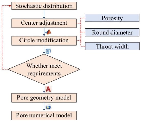 In pore-filled and particle-cemented hydrate deposits, the pores between rock particles constitute the main fluid transport space. We enhanced the random distribution algorithm in MATLAB by utilizing the Mersenne rotation algorithm [24]. This was achieved by generating random numbers uniformly distributed in a rectangular range using the rand function [25]. We input basic information such as pre-studied porosity, diameter of the matrix circle, and width of the throat into the program. Then, we generate a circular matrix, with the area between the circular media serving as the flow channel. It is worth mentioning that the pore structure generated in this manner is unique. We compare the multiple geometric models generated to select the model for further study. We obtained a series of two-dimensional random coordinates based on the specified particle radius and particle density. Circular particles that can overlap and be distributed are arranged to characterize the nonhomogeneous pore structure of the hydrate sedimentary layer. The voids between the units are represented by the circular, overlapping portions, symbolizing the rock particles, while the area between the circles represents the pore medium. The pore medium was generated by entering the circular diameter (100 μm) and porosity, followed by circular position adjustment and overlapping circular modification. By determining the maximum and minimum widths of the throat, we can assess if they meet the requirements of the proposed model. The model will be output in Drawing Exchange Format in AutoCAD 2014 software, and then a two-dimensional pore medium model will be constructed in COMSOL. The complete processing flow is shown in Figure 2.