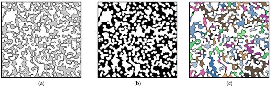 Extraction of geometric feature information of porous media: (a) Pore-scale heterogeneous geometric model; (b) binarization processing; and (c) geometric characteristics of pore structure.