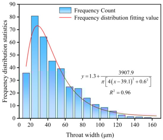 To characterize the distribution of the throat width, the model network structure was imported into ImageJ version 1.54j, and the image was randomly segmented and delineated using the Watershed algorithm based on the grayscale changes [26]. The fissure delineation opening was calculated using the built-in Analyze Particles function of ImageJ. The complete image of the fissure opening is captured, and the frequency distribution of the opening data is analyzed. The distribution interval is set at 10 μm for the frequency histogram. The histogram displaying the frequency distribution of the fissure openings and the corresponding fitted curves are illustrated in Figure 4. The model network structure is predominantly characterized by a microchannel structure. The area with local openings ranging from 10 to 40 μm constitutes 50.11% of all fissures, while the area with local openings ranging from 10 to 60 μm represents 73.5% of the total fissures.