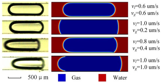 Interfacial interactions are often characterized by dynamic contact angles as the two phases of gas–water flow in microchannels. In this section, the level-set method will be utilized to simulate the gas–liquid flow in a single microchannel at various flow velocities [35]. The numerical simulation results will be compared with the experimental findings conducted by Choi to validate the model’s accuracy [36]. In the simulation, we set the same boundary conditions as those in the experimental setup. The experimental setup parameters are presented in Table 1, and the comparison results between the test and simulation are illustrated in Figure 5. From the comparison of experimental measurements and numerical simulation calculations, it is known that the gas-phase advancing contact angle, the receding contact angle, and the liquid-film thickness match the simulation using the level-set method. This verifies the reliability of the level-set method for such applications.
