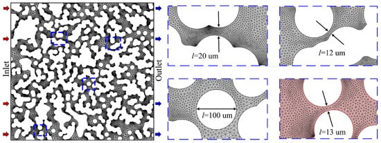 To convert the geometric structure image of the 2D porous media model into a COMSOL geometric model, we first converted it into a DXF file and then imported it into the software. The left end of the model represents the injection end, with injection velocities of 0.2 m/s, 1 m/s, and 5 m/s, while the right end represents the extraction end, with a pressure boundary condition of 0 Pa and no-slip boundaries on the upper and lower walls. For a coupled solution of Navier–Stokes and level-set equations using COMSOL Multiphysics coupling software, the interface thickness is set to one-third of the maximum grid cell size, the initial time length is 10–11 s, and the backward difference method is used to determine the computational time step. The PARADISO solver was used to solve the equations. The Delaunay triangular mesh is used to dissect the porous medium. In the constructed model, we calculated the mesh division with varying degrees of sparsity. When the mesh division is sparse, the calculation results are inaccurate. The gas–liquid interfacial repulsion of a calculation step will lack many details. With the mesh refinement, the calculation results in COMSOL tend to become more accurate. However, as the mesh division precision continues to increase, the improvement in calculation accuracy becomes less significant, while the calculation time increases exponentially. After verifying mesh independence, the mesh with 70,182 elements meets the accuracy requirements for the solution. First, the entire fracture channel is saturated with a liquid phase, and the gas phase is injected from the inlet at the left end of the model to displace the liquid within the pore, while the liquid exits through the outlet. Under the experimental conditions, it is assumed that no heat is absorbed or dissipated during the flow. In addition, the liquid phase is considered incompressible, and the effect of capillary forces during flow is taken into account. The nature of the fluid is assumed to be isotropic. The interior of the rift is a fully connected, contact-free spatial structure. The pore space varies greatly in different regions of the model, so in the mesh generation, the COMSOL embedded mesh method is used to refine the mesh in different pores by adjusting the grid number of the narrow region resolution. The meshing in the throat area should be compact enough to ensure the accuracy of the calculation, and the appropriate coarsening of the mesh in the pore area can reduce the calculation time. To adapt to the boundary of circular pores, the triangular mesh shape is selected, and a total of about 106,811 mesh elements and 1222 boundary cells are divided. The comparison of experimental groups is shown in Table 2. The schematic flow of a nonhomogeneous model and local meshing is shown in Figure 6.