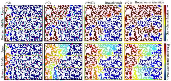 To investigate the effect of the modeled inhomogeneity of the porous media model on the flow, we simulated the methane displacement water process with a wall-wetting angle of 90°, which allows us to exclude the degree of hydrophilicity of the pore medium and only consider the effect of the geometric structure on the flow. The image was thresholded using the binary threshold algorithm to realize the separation of the channel portion and the closed portion of the partitioned image. Further, the channel region was manually selected using the Region Grow algorithm [37], and the pore area occupied by the gas–liquid phase was determined using ImageJ, respectively. The flow phase diagram and pressure cloud diagram are shown in Figure 7, and the change curve of water saturation is shown in Figure 8. Due to the wall resistance, the gas phase first drives off the saturated water in the middle region, and after 2 s, the gas phase mainly drives off the water phase in the upper channel, and the tail-end breakthrough occurs in the upper region at 9.67 s. At this time, the water saturation was 25.4%, 72.2%, and 72.4%, in order; after that, with the continuous injection of gas, the water saturation no longer changed; the water saturation in the upper and central parts of the change was small, only 4.3% and 10.5%, while the water saturation in the lower part of the decline was 30.5%, causing the central region of the water to become bound water. Dominant channels were formed in the upper and lower parts, with effective flow channels accounting for only 58.7% of the total channel area and close to half of the channels becoming ineffective.