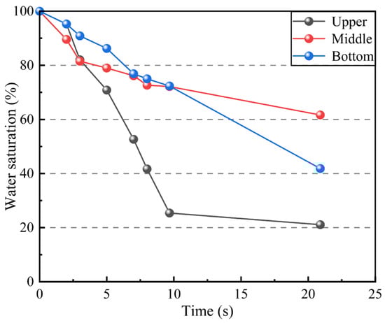 The change in water saturation with time in the upper, middle, and bottom regions.