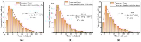 The frequency distribution of pore model throat width: (a) upper; (b) middle; and (c) bottom.