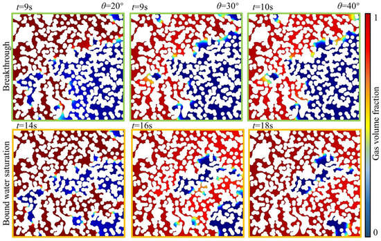 The simulation results of the interface drive at inlet velocities of 3.5 mm/s and 17.5 mm/s, respectively, are shown in Figure 10. The results for inlet velocities of 5 mm/s and 17.5 mm/s, respectively, are shown in Figure 11. The water saturation at the moment of tail-end breakthrough of methane-driven water, when the inlet interface moves at a speed of 3.5 mm/s and the contact angle of the pore medium wall surface is 40°, 30°, and 20°, is 51.5%, 54.8%, and 55.8%, respectively. This indicates that as the pore medium’s hydrophilicity increases, the time for methane tail-end breakthrough to occur decreases, making it easier to form a dominant channel. The gas–water drive process was continued until there was no more water phase at the tail end. At that point, the saturation of bound water was 25.1%, 30.7%, and 33.3%. From the initial tail-end breakthrough to the final stage, methane sequentially drove out 26.4%, 24.1%, and 22.5% of water from the pore medium. When the inlet interface replacement rate was increased by five times, the water saturation of methane replacement water at the moment of tail-end breakthrough was 40.4%, 49%, and 55.8% at the pore medium wall contact angles of 40°, 30°, and 20°. This indicates that with the increase in hydrophilicity in the pore medium, the time for methane breakthrough was reduced, making it easier to form the dominant channel. At this point, only about half of the channel served as a flow pathway for methane. The gas-driven water process was continued until no more water phase appeared at the tail-end. At that point, the bound water saturation levels were measured at 13.4%, 25.5%, and 34.3%. From the moment of breakthrough at the tail end to the final moment, 27%, 23.5%, and 21.5% of water was successively displaced from the pore medium by methane. From the distribution of the phase diagram, it can be observed that methane breakthrough primarily occurs in the upper region, with water being the main liquid discharged in the lower region. The water content in the middle region remains relatively stable, and the discharge of the water phase becomes more challenging with increased hydrophilicity. Additionally, a second breakthrough point does not form under conditions with a contact angle of 20°.