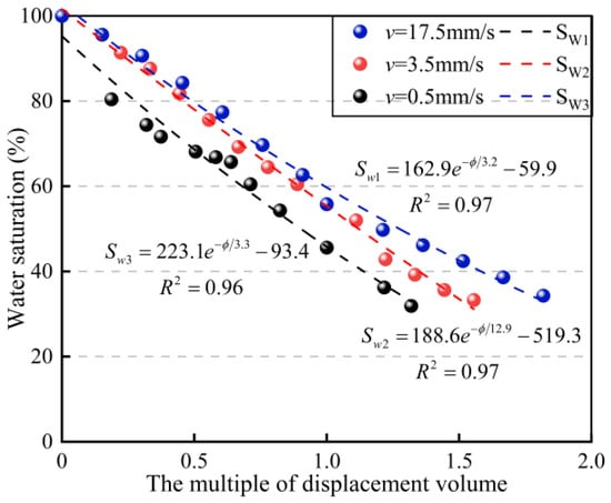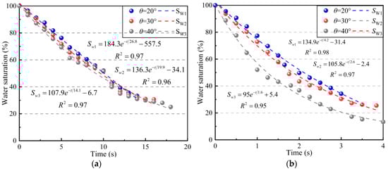 The variation in water saturation within the pore medium of the hydrate sediment layer as a function of time under the two flow rate conditions was established separately and fitted with a negative exponential function, as shown in Equation (13) [38]; fitting results are shown in Figure 12.