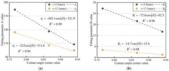 Comparison of parameters for water saturation fitting curves. (a) Fitting the relationship between changes in parameter A; (b) fitting the relationship between changes in parameter B.