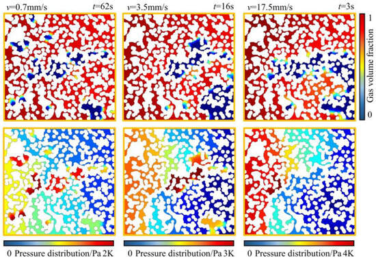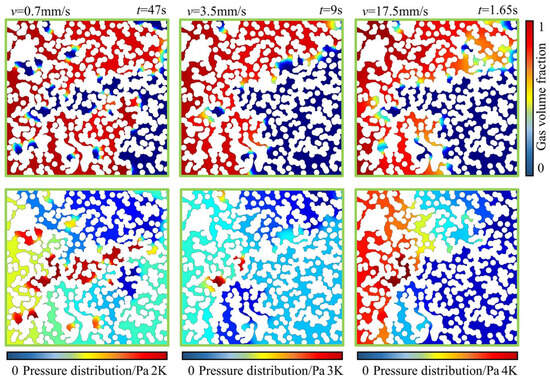 The gas-driven water working conditions were constructed for three flow rate conditions at a contact angle of 20° for the pore medium. The changes in water saturation and pressure clouds at the breakthrough and final moments are illustrated in Figure 14 and Figure 15. The water saturation at the moment of breakthrough was 45.6%, 55.7%, and 55.8% when the inlet interface moving velocity was 0.7 mm/s, 3.5 mm/s, and 17.5 mm/s, respectively. Under low flow rate conditions, the water saturation was low, and the gas phase occupied most of the space. Under high flow rate conditions, it was more likely to form an expulsive dominant channel, leading to premature breakthroughs. After the breakthrough to the moment of stabilization, the water saturation continued to decrease by 13.7%, 22.4%, and 21.5%, respectively. The larger the replacement velocity, the more water phases were replaced. This is because the larger the inlet replacement velocity, the larger the pressure difference. A larger pressure gradient allows the gas phase to enter more pore space, enabling more water phases to be replaced even after the tail-end breakthrough. In addition, the central region is always the primary area where bound water exists under the three flow conditions.