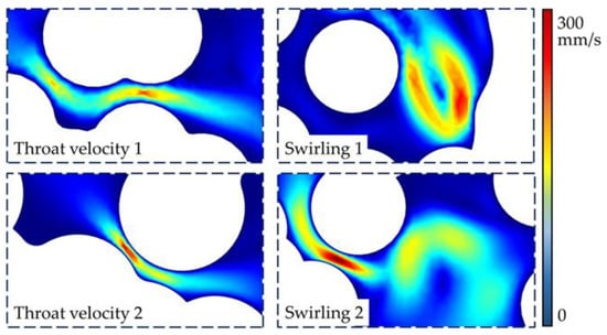 The flow time under the three flow conditions differs greatly. To facilitate comparison, we use the time of the breakthrough moment as a benchmark, and the ratio of different moments to this benchmark is used as a unit of comparison to analyze the characteristics of water content saturation changes under different displacement multiples, as illustrated in Figure 16. At the same displacement multiplicity, conditions with a higher inlet flow rate exhibit higher water saturation and fewer channels occupied by the gas phase. This implies that gas is more likely to flow from larger throats in hydrophilic environments under high flow rate conditions. Additionally, the gas phase further facilitates the capillary pressure into the smaller throats after the tail breakthrough. In addition, we calculated the instantaneous flow velocity in the narrow throat region and the orifice region. The instantaneous flow velocity cloud at v = 17.5 mm/s is shown in Figure 17. The figure illustrates that although the injection is performed at a steady flow rate at the inlet, the instantaneous flow velocity can vary by two orders of magnitude in the local region. The gas-driven water requires a larger driving force to overcome the capillary force when flowing through the throat region, resulting in the formation of a high flow velocity zone. In the area near the back of the throat, there is a sudden release of high flow velocities, leading to the formation of vortex flow.