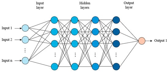 When trying to predict GTSU driving data, which is nonlinear data, it is generally more appropriate to consider artificial neural networks rather than polynomial regression. A multi-layer perception (MLP) network is a typical representative of feedforward artificial neural networks [24]. An MLP is a neural network with two or more layers. An MLP consists of an input layer, a hidden layer, and an output layer. A multi-layer perceptron with only one hidden layer is called a shallow neural network, and a multi-layer perceptron with two or more hidden layers is called a deep neural network. Unlike single-layer perception, multi-layer perceptron can learn from nonlinearly distributed data. Because the multi-layer perception calculates linear equations for weights, it uses an activation function to convert linear data into nonlinear data when passing between layers. The MLP network can distinguish the nonlinear data relationship. In this paper, the MLP network is composed of six layers that contain input, four hidden layers, and an output layer. The input layer has five nodes that contain hoist position, grab status, trolley position, unloading point x-axis value, and unloading point z-axis value. The output layer has one node representing the speed of the main driving part. The structure of the MLP network for predicting the GTSU operation data is shown in Figure 5.