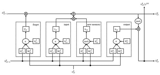 The four gates of the LSTM are composed of a forget gate , an input gate , a new memory unit , and an output gate , where is the layers, is the time step, is the activation function, and are the weight matrices, and and are the bias vectors on the memory cell, respectively.
