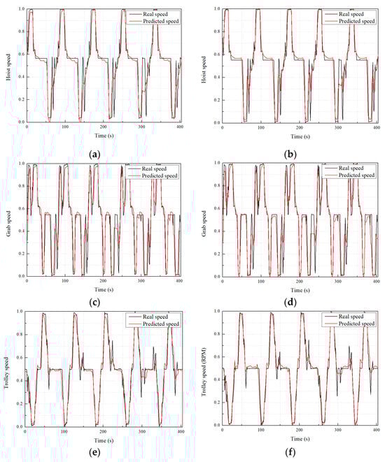 Prediction results: (a) Hoist speed prediction results of MLP model; (b) hoist speed prediction results of LSTM model; (c) grab speed prediction results of MLP model; (d) grab speed prediction results of LSTM model; (e) trolley speed prediction results of MLP model; and (f) trolley speed prediction results of LSTM model.